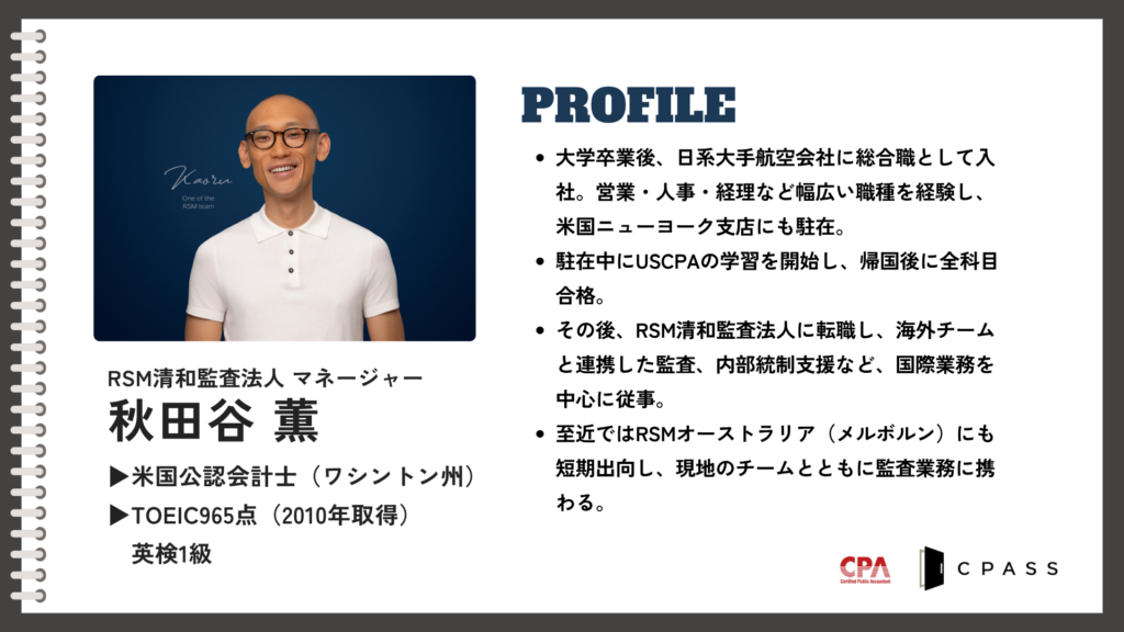 今回のオンラインセミナーでは、RSM汐留パートナーズ株式会社CEOの前川研吾氏(日米公認会計士)、RSM清和監査法人マネージャーの秋田谷薫氏(米国公認会計士)が英語スキル×会計の経験のかけ合わせで広がるキャリアについて語ります!