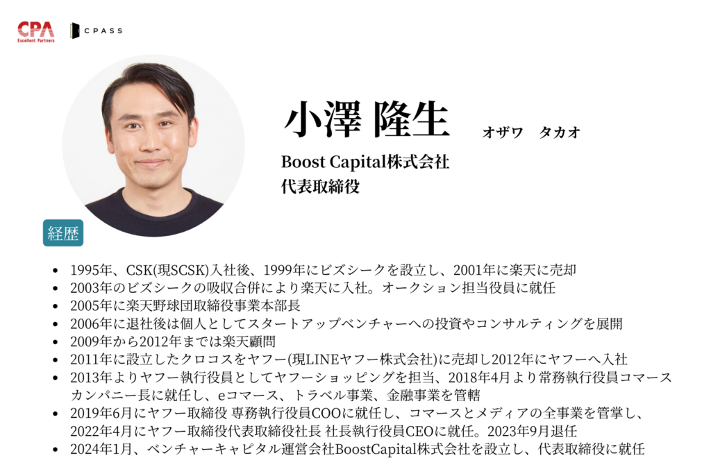 事前の申し込み人数が250名を超えるなど、開催前から非常に高い注目を集めた本イベント。当日は、楽天イーグルスやPayPayの立ち上げ、ヤフーCEOを経てBoostCapital株式会社を創業した小澤隆生氏と、会計×AIを掛け合わせ顧客の事業成長をサポートする株式会社SoVaCEOであり、CPA会計学院の講師としても活躍する山本健太郎氏がご登壇。モデレーターにはグロービス・キャピタル・パートナーズにて投資業務に携わる磯田将太氏を迎えました。