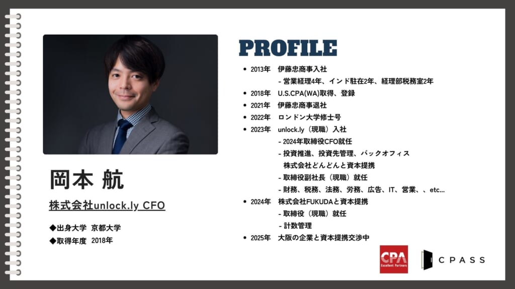 年内最後のUSCPA交流会では、現在事業承継投資会社株式会社unlock.lyの取締役CFOとしてご活躍されている岡本 航さんをゲストにお迎えします!