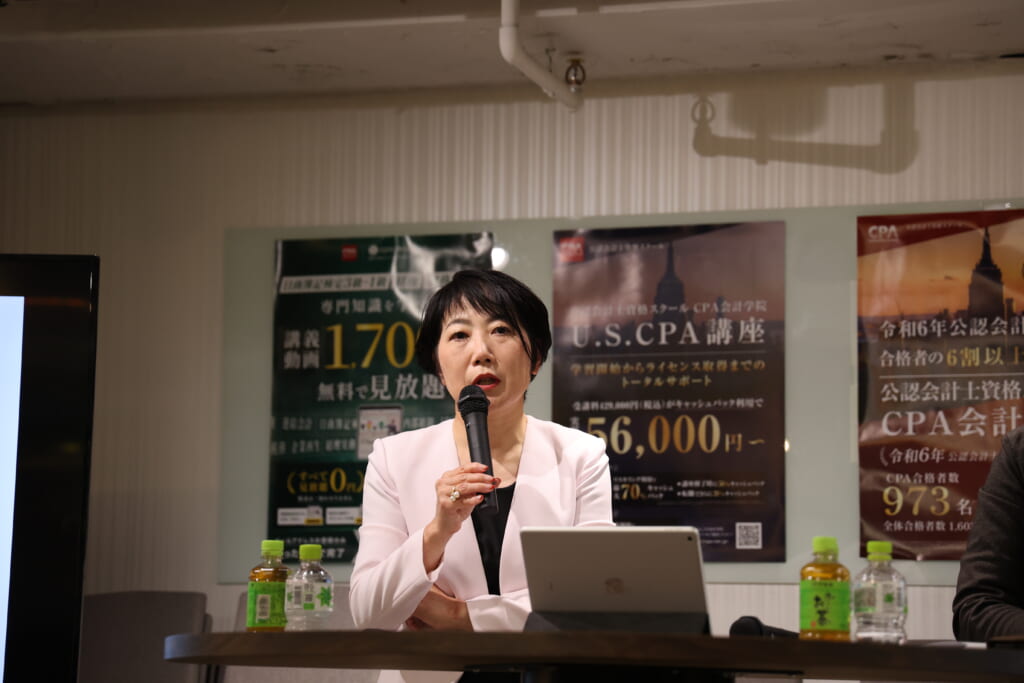 片倉氏は、皆さんの不安や期待の声を受けて、自身のキャリアの原体験から話を始めました。彼女は22歳で会計士に合格してから現在に至るまでのキャリアの軌跡を示しながら、こう語ります。