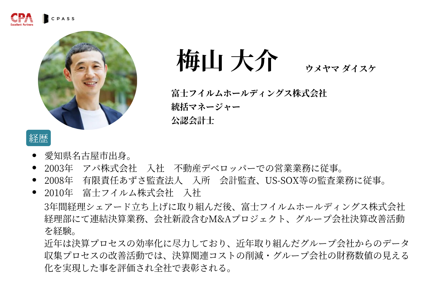 「会計の専門家」という強力な武器を活かし、大手企業で事業の成長や投資を牽引しているトップランナーのお二人。そんなお二人のリアルな経験談を、大手グローバル企業のファイナンスディレクターとしての経験を持つ吉田講師(CPA会計学院 USCPA講座)が、モデレーターとして深掘りします!