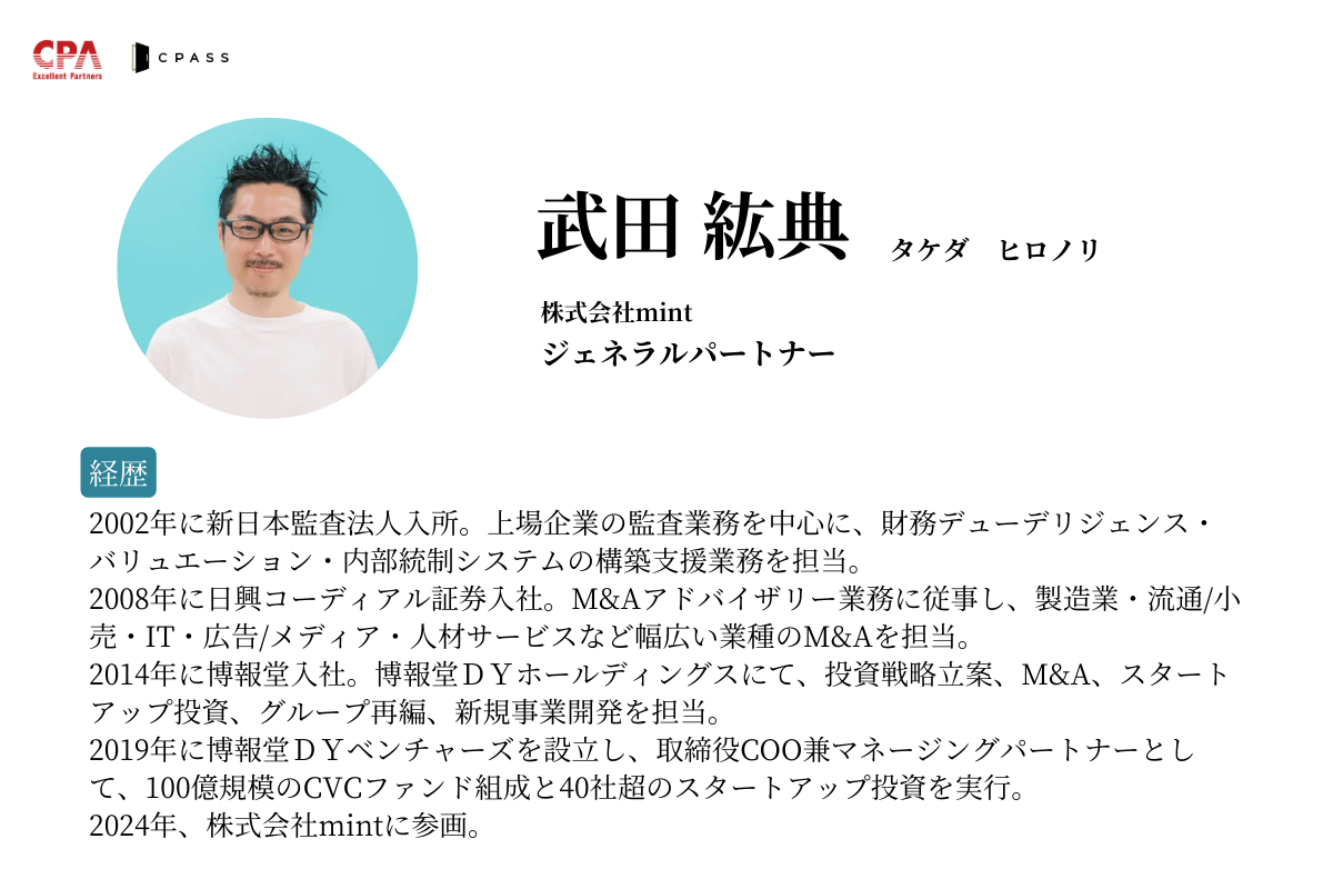 会の前半は、「VC業界についての勉強会」として、グリーベンチャーズ株式会社 取締役・パートナー 中尾 俊輔氏と、株式会社mint ジェネラルパートナー 武田 紘典氏にご登壇いただき、「VC業界とは?」という基礎から、会計士がVC業界で働く魅力、そしてVCに入る前後のキャリアパスまで、赤裸々にお話しいただきます。