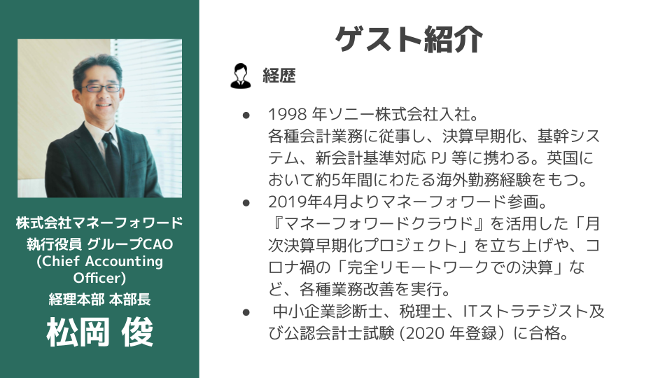 そこで今回のファイナンス交流会では、株式会社マネーフォワードの経理部長である松岡 俊氏(X:ShunMatsuoka40)をゲストにお招きして、マネーフォワードの事例もご紹介いただきながら、生成AIの活用方法とAI時代の経理キャリアについてお話しいただきます。