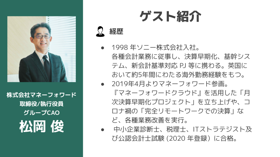 そこで今回のファイナンス交流会では、株式会社マネーフォワードのグループCAOである松岡 俊氏(X:ShunMatsuoka40)をゲストにお招きして、マネーフォワードの事例もご紹介いただきながら、生成AIの活用方法とAI時代の経理キャリアについてお話しいただきます。