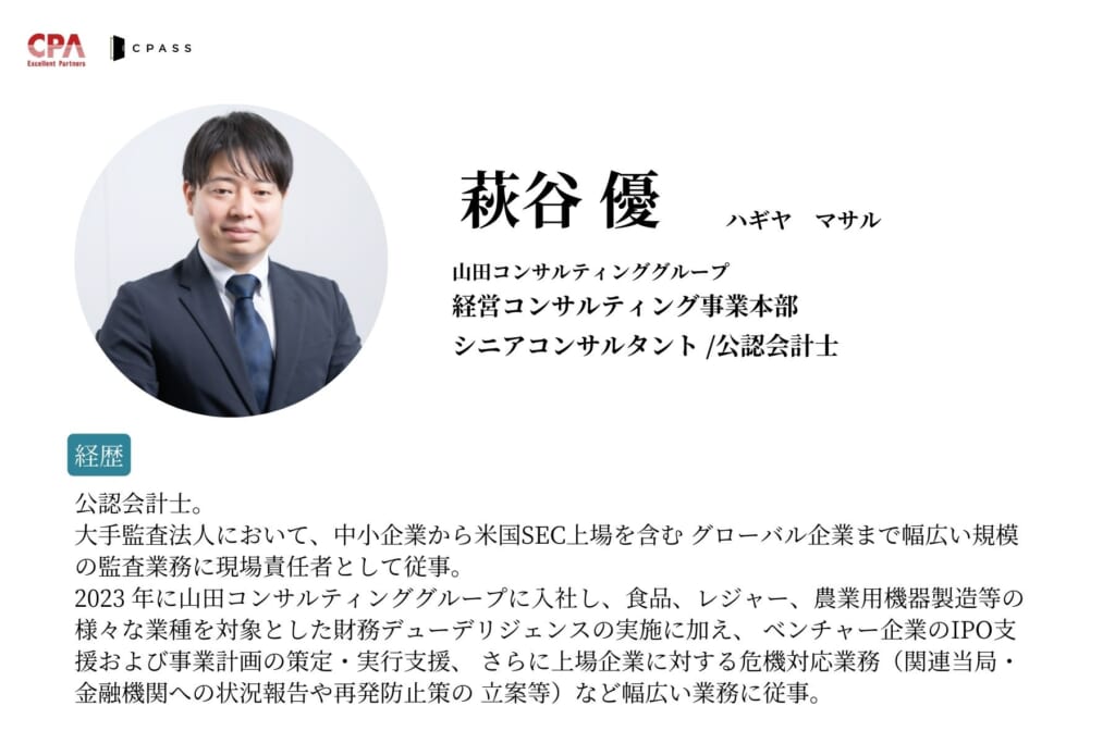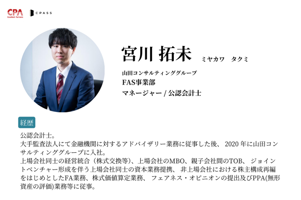 本セミナーでは、独立系FAS最大手の山田コンサルティンググループより、会計士のゲストを2名お招きし、M&Aアドバイザリーと事業再生コンサルティングの業務内容の詳細やそれぞれのやりがい、キャリアとしての魅力、Big4FASとの違いを深掘りします。