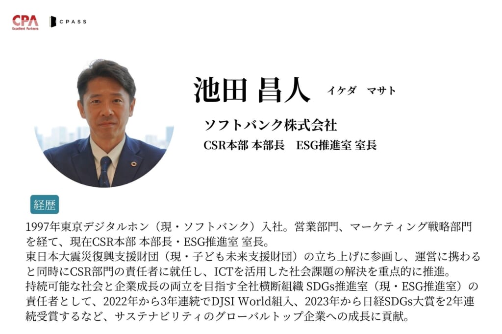 そこで本イベントでは、ソフトバンクをサステナビリティのグローバルトップ企業へと押し上げ、日経SDGs大賞の連続受賞などを牽引した池田昌人氏と、15年以上にわたって企業の開示支援や統合報告書制作をリードする宝印刷D&IR研究所の多田尋一氏をゲストにお迎えし、トークセッション&交流会を行います!
